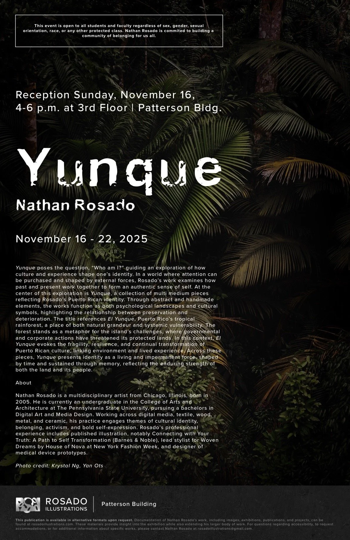 Yunque poses the question, "Who am I?" guiding an exploration of how culture and experience shape one's identity. In a world where attention can be purchased and shaped by external forces, Rosado's work examines how past and present work together to form an authentic sense of self. At the center of this exploration is Yunque, a collection of multi medium pieces reflecting Rosado's Puerto Rican identity. Through abstract and handmade elements, the works function as both psychological landscapes and cultural symbols, highlighting the relationship between preservation and deterioration. The title references El Yunque, Puerto Rico's tropical rainforest, a place of both natural grandeur and systemic vulnerability. The forest stands as a metaphor for the island's challenges, where governmental and corporate actions have threatened its protected lands In this context, El Yunque evokes the fragility, resilience, and continual transformation of Puerto Rican culture, linking environment and lived experience, Across these pieces, Yunque presents identity as a living and impermanent force, shaped by time and sustained through memory, reflecting the enduring strength of both the land and its people.